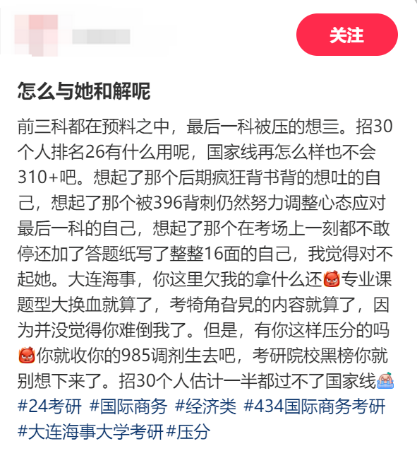 部分网友反应大连海事大学,题型不固定,几乎是年年不重样,变幻莫测,让许多考生都非常苦恼。并且国际商务专业拟招30个,结果排名第九的考生就无法过国家线,实务只有一个人能上三位数,各位考生慎重选择。