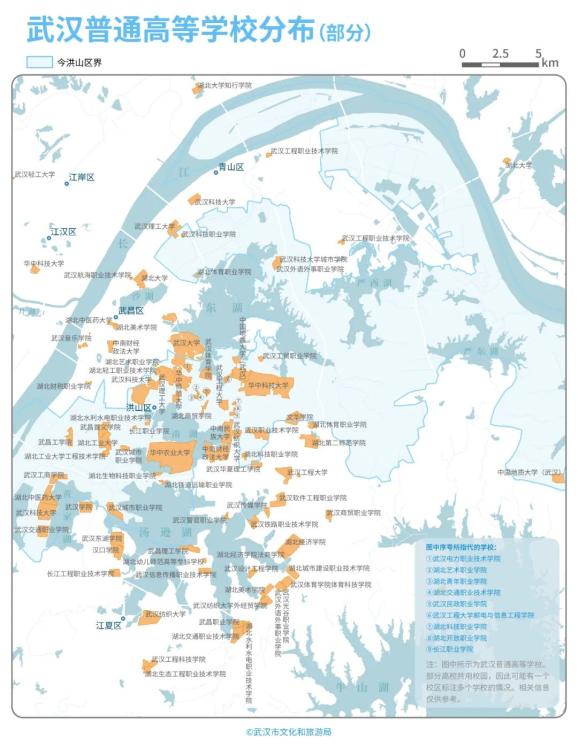 武汉84所普通高校,洪山区占了将近一半;全市2所985、5所211,有6.5所的主校区在这里(武汉大学本部被八一路一分为二,南边属于洪山区);整个武汉,超过一半的在校大学生,都生活在洪山。