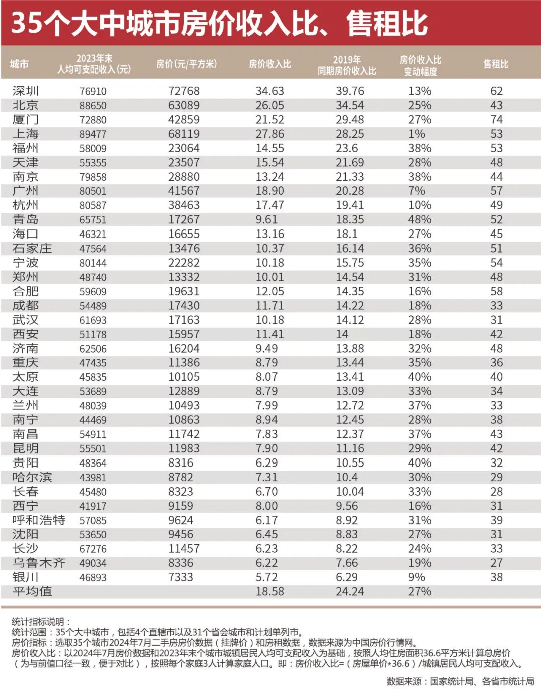 在二线城市中,南京、福州、宁波、南昌、石家庄、郑州、济南、重庆、大连、兰州、哈尔滨、长春、呼和浩特等城市房价收入比降幅均超过30%。一线城市中,上海房价收入比降幅最小,仅为1%,说明上海房价依然坚挺,几乎保持了与居民可支配收入同频上涨;房价排名第一的深圳,房价收入比虽然相比5年前下降了13%,但仍以34.63的数值高居榜首;北京房价收入比也下降了25%,从2019年的第二位降至第三位。