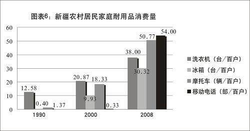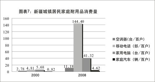 城乡居民家庭耐用消费品数量不断增长。农村居民家庭每百户拥有洗衣机数量从1990年的12.58台、2000年的20.87台,增长到2008年的38.00台;冰箱数量从1990年的0.40台、2000年的9.93台,增长到2008年的30.32台;摩托车数量从1990年的1.37辆、2000年的18.33辆,增长到2008年的50.77辆;移动电话数量从2000年的0.33部,增长到2008年的54.00部。城镇居民家庭每百户拥有空调器从2000年的2.78台增长到2008年的11.18台;移动电话从2000年的4.81部增长到2008年的144.40部;家用电脑从2000年的5.68台增长到2008年的41.32台;家庭汽车从2000年的0.82辆增长到2008年的4.62辆。