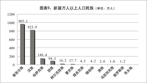 新疆民族众多。据2000年全国第五次人口普查,新疆共生活着维吾尔、汉、哈萨克等55个民族。2008年,新疆总人口为2130.8万人,其中汉族以外的其他民族1294.5万人,占全疆人口的60.8%。截至2007年,百万以上人口的民族有3个:维吾尔族(965.1万)、汉族(823.9万)、哈萨克族(148.4万);10-100万人口的民族有3个:回族(94.3万)、柯尔克孜族(18.2万)、蒙古族(17.7万);1-10万人口的民族有6个:塔吉克族(4.5万)、锡伯族(4.2万)、满族(2.6万)、乌孜别克族(1.6万)、俄罗斯族(1.2万)以及东乡族。其余民族人口不到万人。