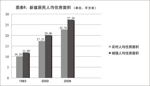 人民群众生活条件不断改善。交通工具多样化使人们出行更加方便快捷,改革开放初期从乌鲁木齐到北京乘火车需耗时近一周,现今乘飞机仅需3个多小时。城市每万人拥有铺装道路由1978年的1.6公里、2000年的4.5公里,增长到2008年的15.7公里;城市每万人拥有公共汽车数量从1978年的3.1标台,增加到2008年的13.2标台。住房条件得到极大改善。农村人均住房面积从1983年的10.20平方米、2000年的17.25平方米,增长到2008年的22.79平方米;城镇人均住房面积从1983年的11.90平方米、2000年的20.06平方米,增长到2008年的27.30平方米。目前,全疆设市城市自来水普及率为97.86%,县城为87.18%;城镇集中供热普及率为51.2%,污水处理率为68%,生活垃圾无害化处理率为16%;城市燃气普及率为89.33%,县城为66.67%;城市绿化覆盖率为30.49%,绿地率为26.19%,人均公共绿地面积为6.94平方米。近年来,南疆库尔勒、和田、喀什、阿图什、阿克苏、墨玉、洛浦、疏勒等23个县市的30多万户各族群众用上了清洁且价格优惠的天然气。目前,南疆地区天然气新用户以每月上千户的规模增长,“砍胡杨、烧胡杨”正在成为历史。
