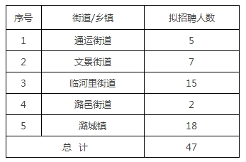 全区计划面向社会公开招聘社区居委会筹备组服务站专职工作人员47人。每人限报一个街道或乡镇。具体招聘计划如下: