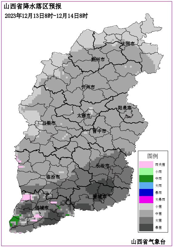 今天夜间到明天白天:全省多云转阴天,大部分地区有小雪或雨夹雪,忻州和阳泉的部分地区有中雪,局部地区有大雪;太原、晋中、长治等地的局部地区有中雪。最低气温:高寒地区-14℃左右,北部及中南部山区-11~-5℃,中南部其余地区-5~0℃;最高气温:全省-5~4℃。