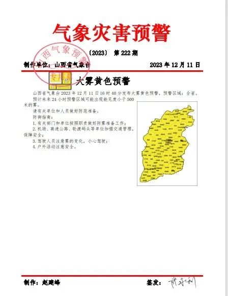 山西省气象台2023年12月11日16时40分发布大雾黄色预警,预警区域:全省。预计未来24小时预警区域可能出现能见度小于500米的雾。请有关单位和人员做好防范准备。