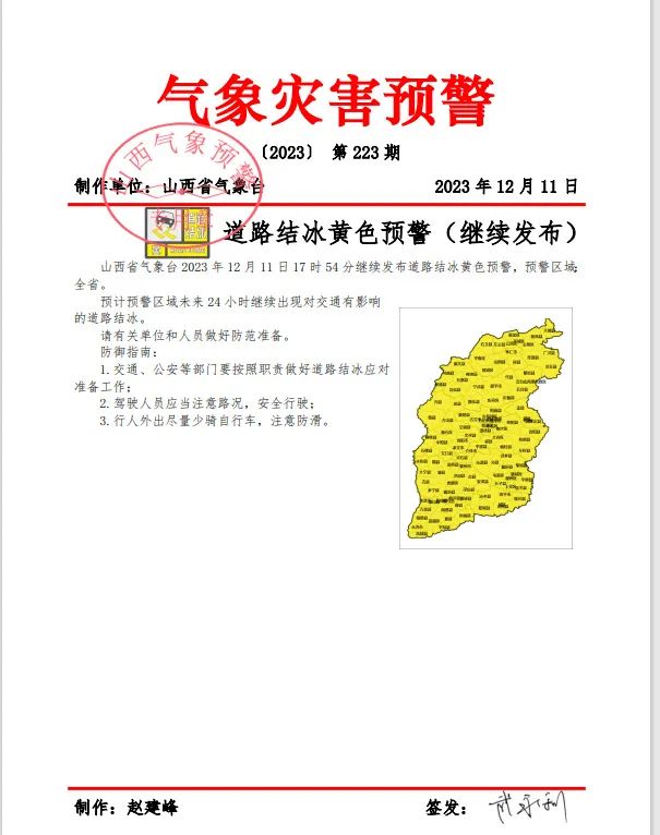 山西省气象台2023年12月11日17时54分继续发布道路结冰黄色预警,预警区域:全省。预计预警区域未来24小时继续出现对交通有影响的道路结冰。请有关单位和人员做好防范准备。