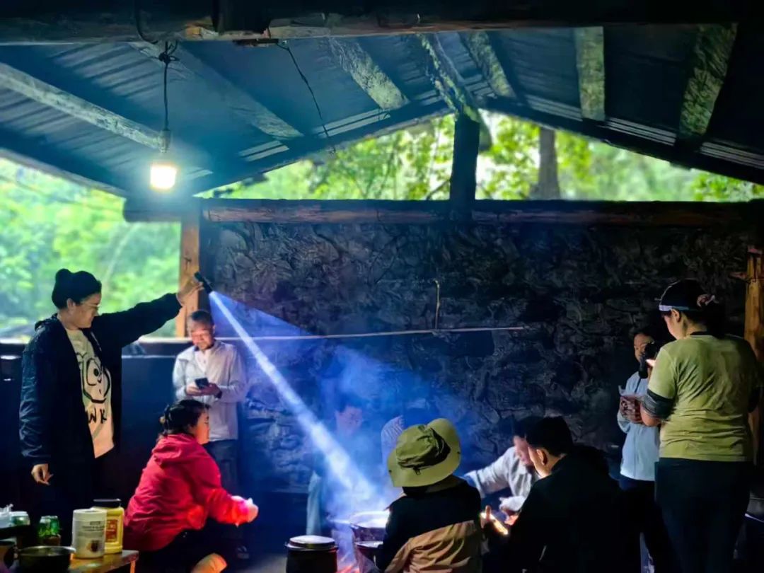 徒步的第三晚,我们借宿在曲那通的小木屋。小木屋兼作小旅馆,供往来朝圣者食宿。老板的女儿也转山去了,晚饭让大家自己解决。连续走了三天,我们已累瘫,只在火塘上随便煮了一锅面,囫囵吃完。左贡县的朝圣者再煮饭炒菜,察隅县的朝圣者竟然和面、揪面片,火塘边的光不够,便从高处举手电筒照着……那是怎样一幅场景啊!厨房长条状,内侧的火塘边永远有人做着饭,周边围坐着一圈烤火、聊天、候场做饭的人;中间矮桌上坐着三四拨正在吃饭的人,糌粑、酥油茶、青稞酒,这些原本只在一张桌子上的食物,很快在几桌间流动起来;门边还不断有人乒乒乓乓切着菜……火塘里的柴火噼里啪啦响着,比柴火声更响的,是窗外喧哗的雨声。比雨声更响的,是人们的笑声。
