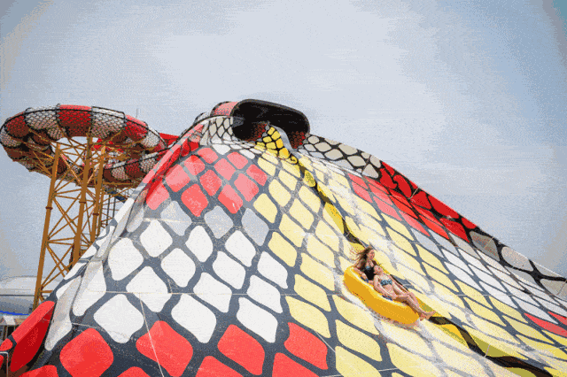 巨蟒缠绕:外形似巨蟒盘旋而立,严厉的色彩让人不寒而栗,从18.5米的制高点乘坐皮筏,俯冲回旋而下,即可感受肾上腺激素飙升的快感,能让您乐而忘返。