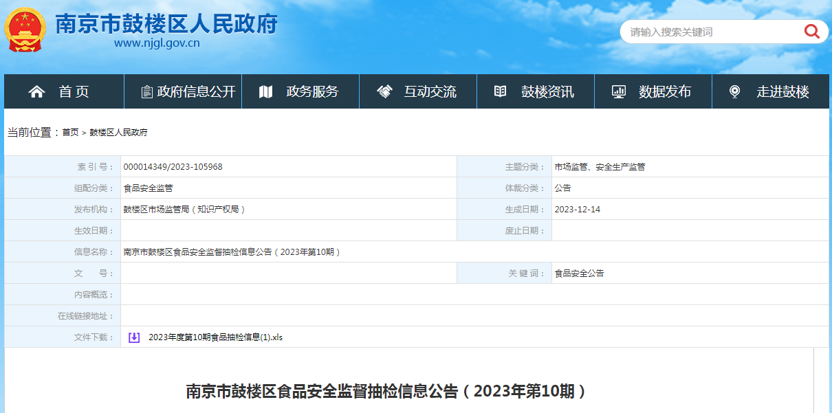 南京市鼓楼区食品安全监督抽检信息公告(2023年第10期)