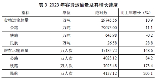 全年货物运输总量29745.56万吨,比上年增长10.9%;货物运输周转量601.62亿吨公里,增长7.5%。旅客运输总量15185.72万人次,增长148.6%;旅客运输周转量328.66亿人公里,增长173.6%。年末国际航线108条,比上年末增加4条。全年境外航班通航6389架次。年末全市机动车保有量529.73万辆,比上年末增加43.85万辆,其中,私人汽车保有量481.25万辆。