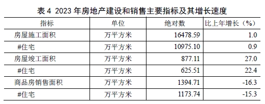 全年房地产开发投资比上年下降11.3%,其中,住宅投资下降9.0%。商品房销售面积1394.71万平方米,下降16.3%。