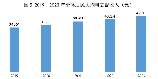 根据城乡一体化住户调查,全年全体居民人均可支配收入42818元,比上年增长6.5%。按常住地分,城镇居民人均可支配收入51178元,增长5.7%;农村居民人均可支配收入19826元,增长8.4%。城乡居民收入比为2.58,比上年缩小0.07。
