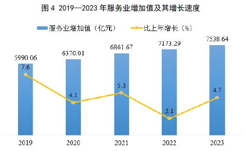 全年批发和零售业增加值876.33亿元,比上年增长1.1%;交通运输、仓储和邮政业增加值380.23亿元,增长11.4%;住宿和餐饮业增加值184.45亿元,增长18.8%;金融业增加值1291.23亿元,增长4.6%;房地产业增加值883.00亿元,下降2.2%;其他服务业增加值3807.31亿元,增长5.6%。