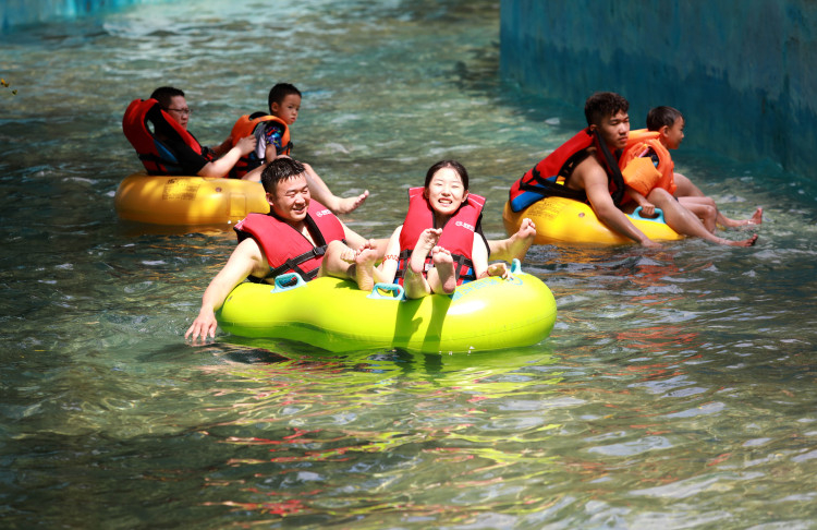 ↑ 6月25日,游客在石家庄市鹿泉区一家水上乐园戏水游玩。 新华社发(梁子栋摄)