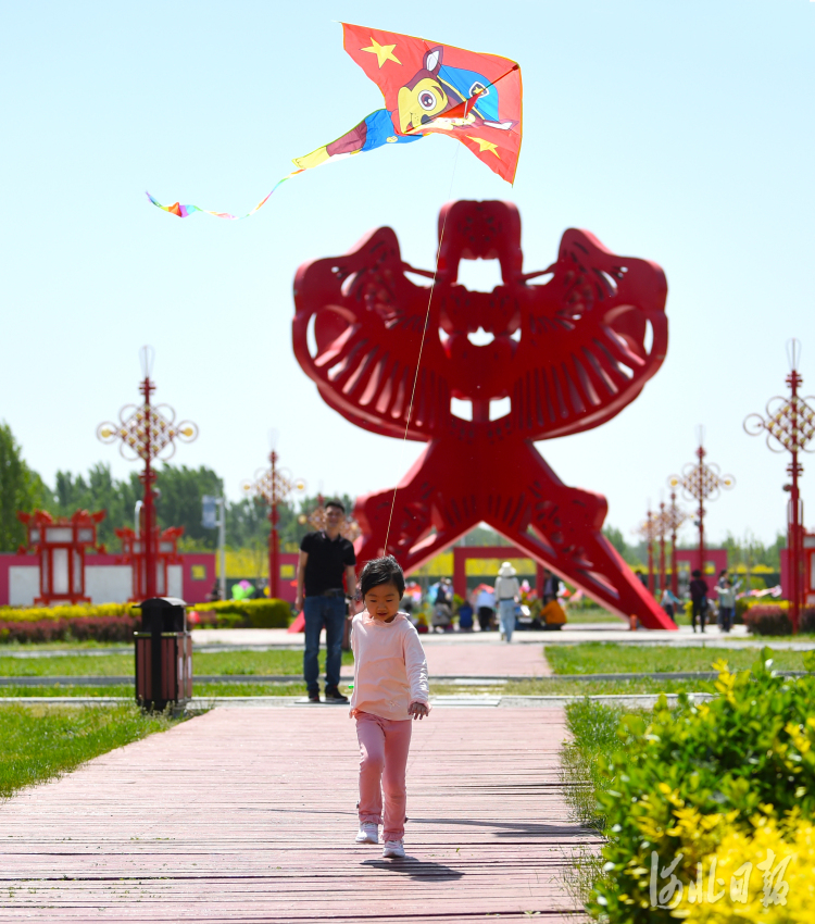 ↑ 游客在廊坊市第什里风筝小镇的风筝广场放飞风筝。河北日报记者赵永辉摄