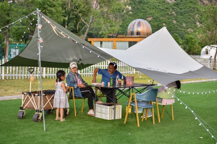 ↑ 游客在河北涉县太行红河谷一处房车露营地露营。新华社记者朱旭东摄