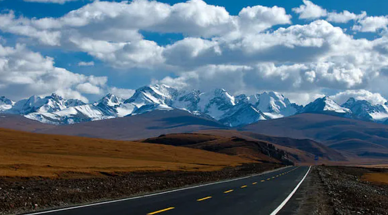 其中,北面的青藏公路,是从青海格尔木出发,翻越昆仑山、唐古拉、念青唐古拉,沿途海拔极高,远远望去,仿佛公路直上云霄,是名副其实的“天路”。