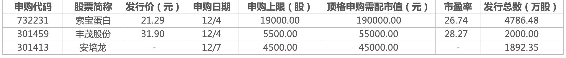 本周新股发行仍为3只,分别是丰茂股份、索宝蛋白、安培龙。丰茂股份将于12月4日进行网上、网下申购;同一日发行的还有索宝蛋白,本次公开发行股票数量为4786.48万股,发行价格为21.29元/股;安培龙将于12月7日开启网上、网下申购。