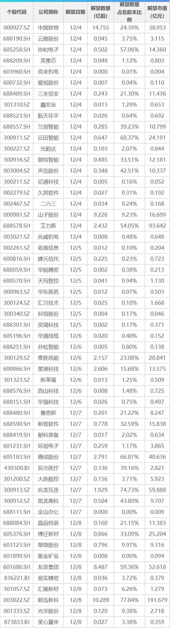 本周超50家公司限售股陆续解禁,以12月1日收盘价计算,市值约为723.77亿元,较本周量增价减。其中,解禁市值较大的公司有联泓新科、艾力斯、兆龙互连、确成股份、中国铁物等。