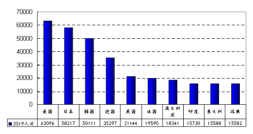 2019年位列宁波市入境客源国前十位的国家分别是美国、日本、韩国、德国、英国、法国、澳大利亚、印度、意大利、瑞典。(2018年位列宁波市入境客源国前十位的国家分别是美国、日本、韩国、德国、英国、法国、加拿大、澳大利亚、印度和意大利)。2019年住宿设施接待入境客源国前10强均呈下降趋势,降幅较大。