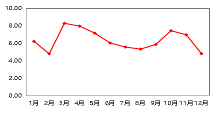 月份 1月 2月 3月 4月 5月 6月 接待 6.21 4.79 8.27 7.94 7.14 6.02 增幅 -8.23 2.58 0.18 -13.03 -4.51 -11.44 月份 7月 8月 9月 10月 11月 12月 接待 5.56 5.32 5.85 7.42 6.96 4.80 增幅 2.67 7.74 -14.10 -12.50 -11.12 -34.37