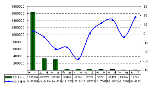 图1-2:2019年住宿设施接待入境过夜旅游者人次(万人次)