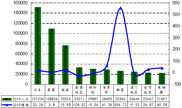 2019年位列出境旅游目的地前10位的国家和地区分别为日本、泰国、越南、香港地区、新加坡、俄罗斯、韩国、澳门地区、台湾地区、柬埔寨。在位列前10位的出境旅游目的地中,俄罗斯、柬埔寨、台湾地区、日本、越南出境人次增幅显著,增幅分别为61.36%、40.38%、26.87%、20.24%和19.98%。前往香港地区和新加坡的旅游者较往年有所减少,降幅为28.52%和5.56%。值得关注的是,持续低迷的韩国市场终于回暖,在2019年出境人次实现了井喷式增长,增幅高达556.72%,挤入前十排名。此外,选择缅甸、挪威、丹麦等出境旅游目的地的旅游者人次明显增多,出境人次分别为9147、1937和1177,增幅高达为2215.7%、257.38%和160.4%。