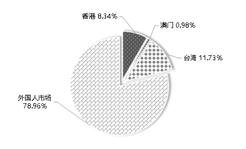 从各市场在入境市场中所占比重情况来看,2019年,住宿设施共接待入境过夜旅游者76.22万人次,其中接待外国人60.18万人次、香港同胞6.35万人次、澳门同胞0.75万人次、台湾同胞8.94万人次。入境过夜旅游者构成以外国人市场为主体,占比高达78.96%,其次为台湾市场、香港市场和澳门市场,占比分别为11.73%、8.34%和0.98%。与往年相比,港澳市场入境过夜旅游者所占比重有所下降,所占比重由2018年的8.85%和2.71%下降为2019年的8.34%和0.98%。2019年住宿设施接待入境过夜旅游者构成如图1-3所示。