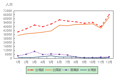 月份 出境游 增幅(%) 出国游 增幅(%) 港澳游 增幅(%) 台湾游 增幅(%) 1月 40165 17.13 34807 14.55 3874 24.09 1312 67.56 2月 44857 21.62 37316 30.14 6168 -7.08 1373 -2.90 3月 50506 9.54 38310 18.12 10531 -15.12 1665 31.10 4月 47989 55.35 39653 54.21 5756 22.89 2580 424.39 5月 52144 37.43 41629 23.34 6613 92.97 3852 422.66 6月 58397 65.80 50263 63.58 6016 65.78 2118 144.86 7月 56602 46.34 49549 53.35 4969 -7.62 2084 111.14 8月 55329 6.05 51575 9.31 1993 -49.74 1761 71.30 9月 53269 23.81 51293 39.44 1050 -79.8 866 -14.68 10月 54591 59.46 52475 73.08 1171 -64.61 724 19.47 11月 47970 17.08 45734 31.81 1717 -65.59 449 -56.02 12月 66211 39.61 62671 59.46 2211 -67.60 1139 -3.80
