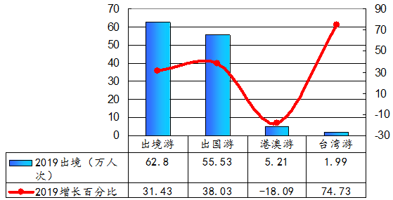 2019年,宁波市旅行社组织出境游客62.80万人次,同比增长31.43%。其中出国游客55.53万人次,同比增长38.03%;港澳游5.21万人次,同比下降18.09%;台湾游1.99万人次,同比增长74.73%。如图1-5所示。