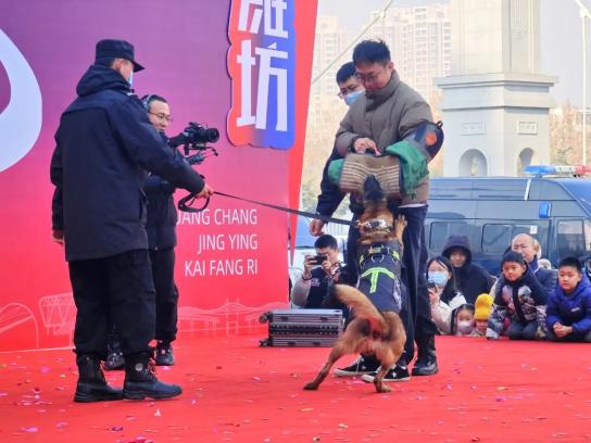 见“电子同事”如此出类拔萃,潍坊市公安局警犬基地的警犬也不甘示弱。活动主舞台,只见“福仔”在没有牵引绳引导下,根据训导员指令完成了坐、卧、靠、立、定等服从科目,这是它与训导员成千上万次的反复磨合才得以形成的肌肉记忆。在搜排爆科目里,“福仔”也用出色表现展示了它作为搜爆犬的基本功。从首届广场警营开放日初次亮相,到如今成为家喻户晓的明星警犬,“福仔”也在一次次用实力打败着质疑。去年10月,“福仔”通过工作犬考核,正式踏上了从警之路。