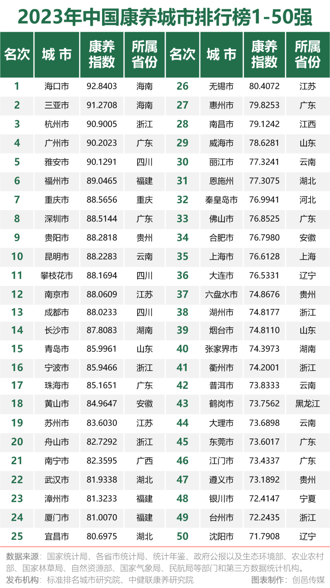 12月12日,在北京召开的第二届康养中国论坛上,标准排名城市研究院、中健联康养研究院联合发布“2023年中国康养城市排行榜”。榜单显示,海口市、三亚市、杭州市、广州市、雅安市、福州市、重庆市、深圳市、贵阳市、昆明市成为最新的康养城市十强城市,海口市再次霸榜第一。