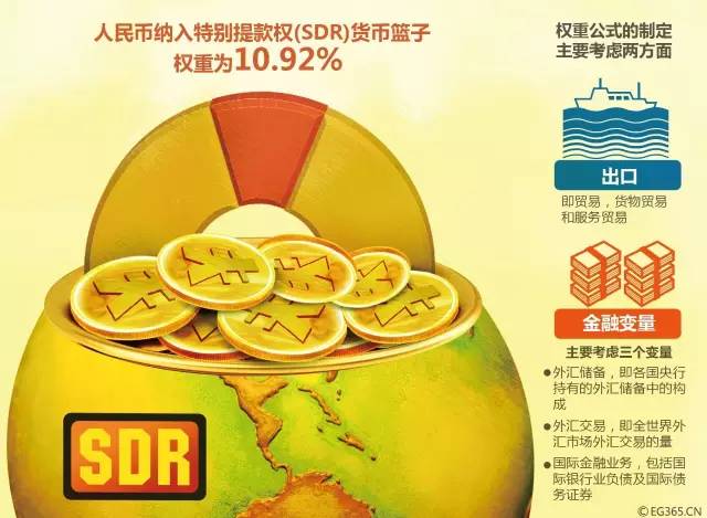 人民币入篮之后,在SDR篮子中的比重为10.92%,其他四种货币的权重则相应减少。人民币的权重超越日元和英镑,成为SDR货币篮子中第三大货币。