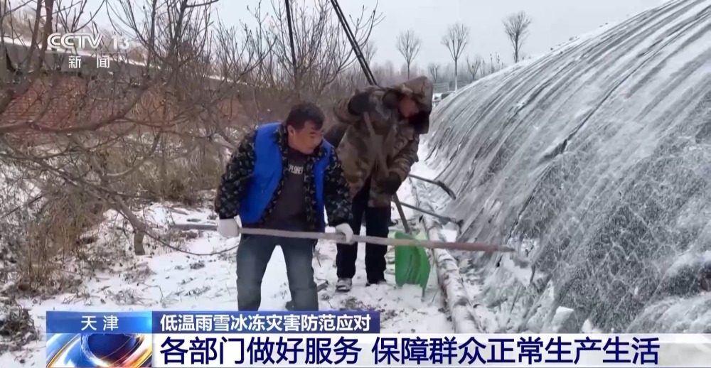 天津市宁河区芦台街道曹庄子村党总支副书记 刘依茁:通过清扫,一方面是为了保证棚内的正常光照,另一方面也是避免大棚被积雪压倒垮塌。