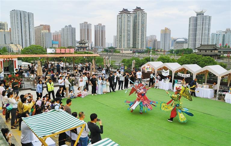 5月2日,游客在西安建国门老菜场市井文化创意街区观看演出。