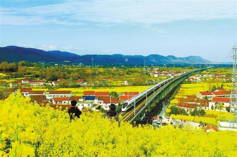 高铁从汉中市南郑区“油菜花海”中飞驰而过。
