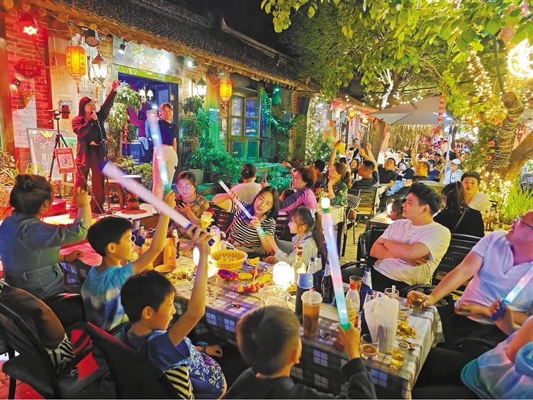 5月1日晚,游客在咸阳市礼泉县袁家村酒吧一条街和歌手互动,享受假日休闲时光。