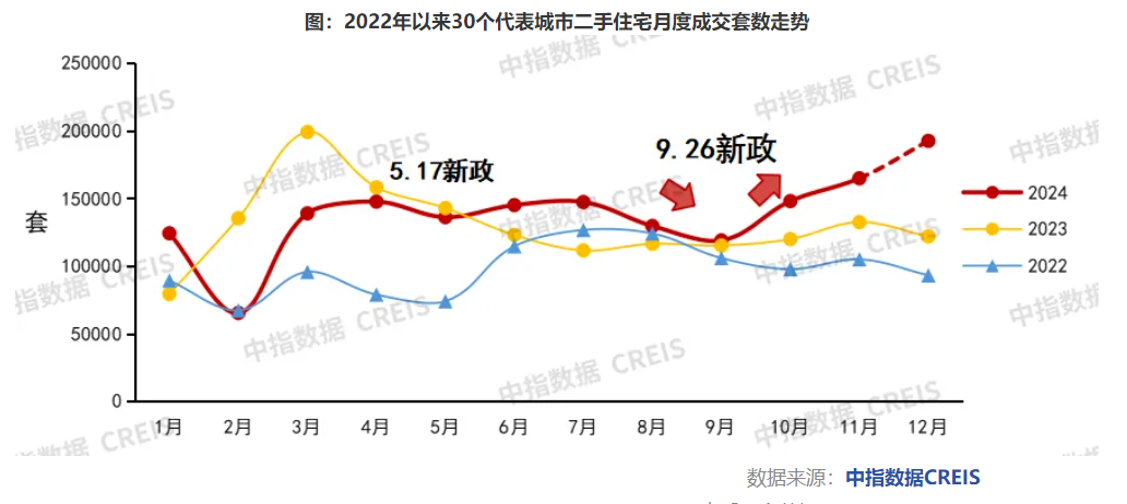 从成交来看,据克而瑞统计数据,2024年重点30城一二手房总成交面积预计达到3.7亿平方米,较2023年微降8%。其中,二手房成交量持续增长但增幅放缓;新房成交量稳中有降,降幅收窄至24%。