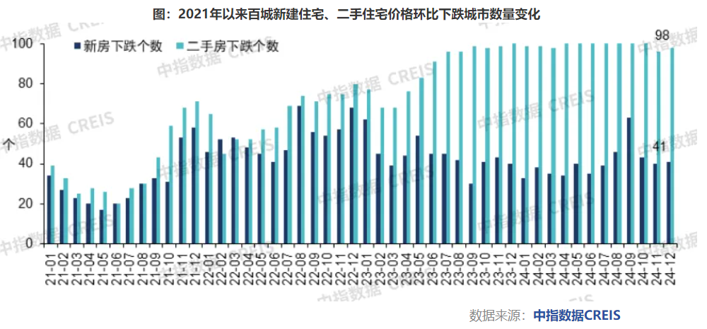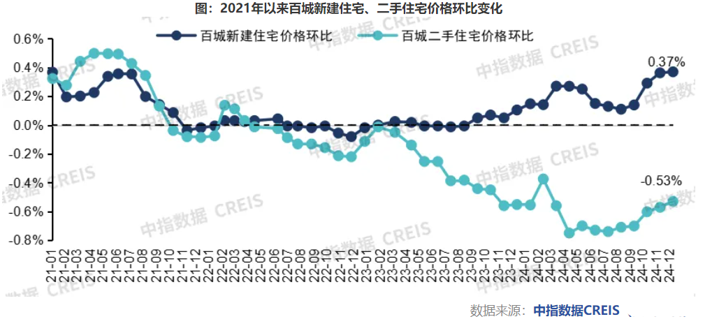 中指研究院数据显示,2024年12月,百城二手住宅平均价格为14203元/平方米,环比跌幅较上月进一步收窄至0.53个百分点,一线城市中北京、上海和广州二手房价格跌幅较之前明显收窄。从涨跌情况来看,百城中仅深圳和成都两城12月二手房价格环比上涨。