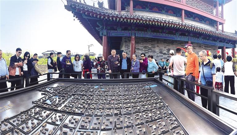4月11日,游客在西安城墙上观看唐长安城示意图。王志辉摄