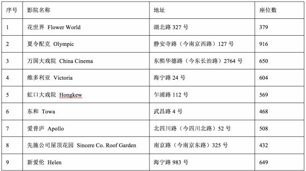 就表中9家放映场所来看,在所有权方面,有4家(夏令配克、万国、维多利亚和虹口大戏院)属于西班牙商人雷玛斯(A. Ramos),2家(爱普庐、新爱伦)属于葡籍俄人郝思倍(S. Hertzberg),2家(花世界、先施公司屋顶花园)属华商,1家(东和)为日商所有;在空间分布上,6家在苏州河以北(今虹口区境内),而3家在苏州河以南(今黄浦、静安两区境内,其中独立影院只有夏令配克1家);从类型来看,外商经营的7家均为独立影院,华商的2家是附设在游乐场中的放映场所。