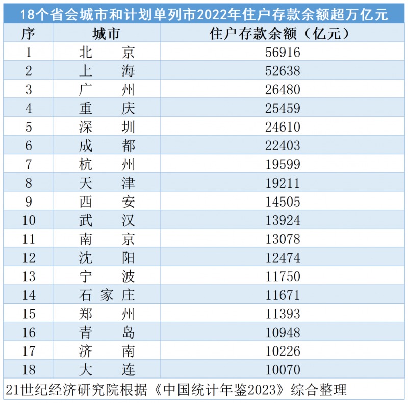 2022年,全国省会城市和计划单列市中,有北京、上海、广州、重庆、深圳、成都、杭州、天津、西安、武汉、南京、沈阳、宁波、石家庄、郑州、青岛、济南、大连18座城市住户存款余额超过万亿元。其中,北京和上海住户存款余额已超过5万亿元,与其他城市拉开较大差距。