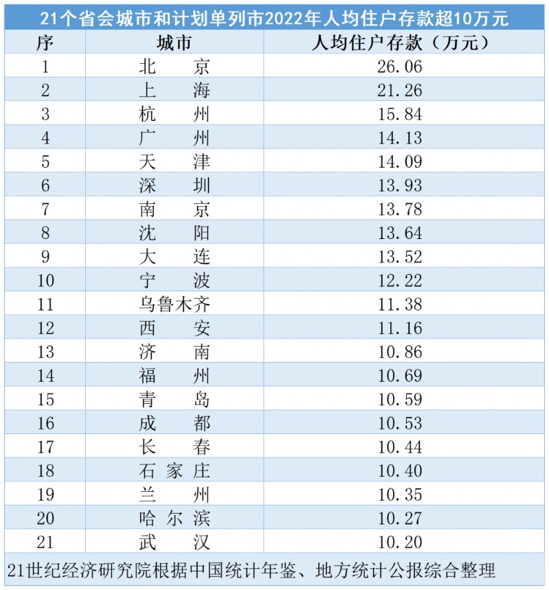而北京、上海、杭州、广州、天津、深圳、南京、沈阳、大连、宁波、乌鲁木齐、西安、济南、福州、青岛、成都、长春、石家庄、兰州、哈尔滨、武汉21座城市2022年住户人均存款余额已超过10万元。其中,北京、上海人均存款余额超过20万元,分别为26.06万元和21.26万元。杭州住户人均存款余额为15.84万元,在所有省会城市和计划单列市中排名第3位,仅次于北京和上海。此外,广州和天津的人均存款在2022年也超过14万元。