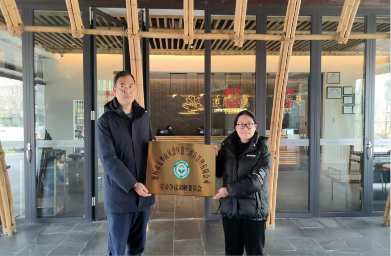 为积极有效预防和及时妥善处理劳动争议,切实维护劳动者和用人单位的合法权益,切实发挥劳动争议调解在促进劳动关系和谐和社会稳定中的重要作用。12月14日上午,池州市九华山畅游电子商务有限公司举行企业劳动争议调解委员会揭牌仪式。活动现场,池州市九华山风景区党工委委员、管委会副主任兼政法委书记李刚、九华山风景区社会保障局局长刘卫胜共同为九华山畅游电子商务有限公司劳动争议调解委员会揭牌。