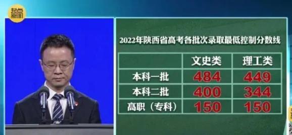 2022年陕西省普通高校招生录取最低控制分数线刚刚公布,本科一批:理工类为449分,文史类为484分;本科二批:理工类为344分,文史类为400分。