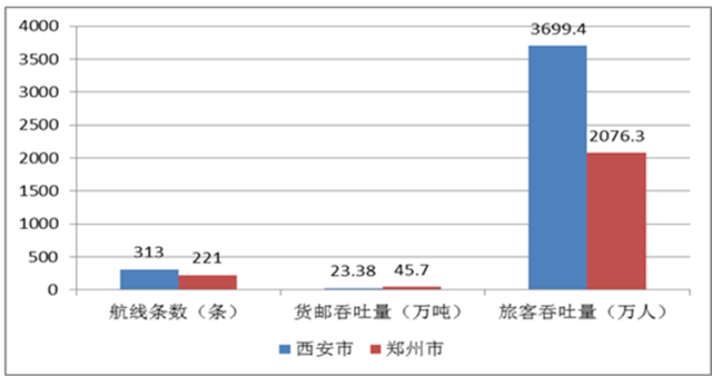 郑州新郑国际机场和西安咸阳国际机场同为我国八大枢纽性机场之一。2016年,郑州新郑国际机场共有航线221条,比西安咸阳国际机场少92条;完成货邮吞吐量45.7万吨,是西安咸阳国际机场的近2倍;旅客吞吐量2076.3万人次,是西安咸阳机场的56.1%。全货运航线34条,比西安多22条。可以看出,因为旅游业的带动,西安的航空旅客运输发展较好,而郑州的航空物流发展则远超西安。