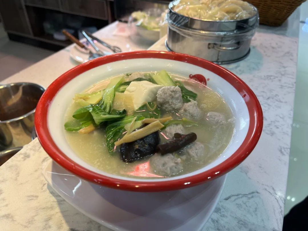 对于喜欢喝汤的朋友来说,这道生汆丸子汤可是不容错过的美味。生汆丸子汤里的食材非常丰富,肉丸颗颗饱满,鲜嫩Q弹,同时搭配一些腐竹、青菜、粉丝,营养丰富,吃起来鲜香无比,回味无穷。“十一”期间,恰逢秋凉,在寒冷的早晨,一碗热乎的生汆丸子汤下肚,身上的毛孔尽数舒展开来,美滴很!