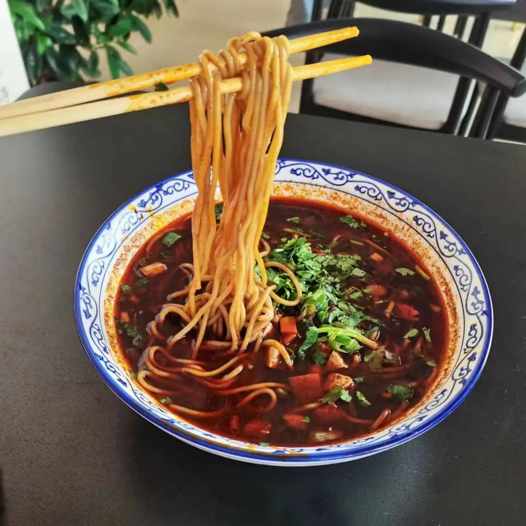 乾州挂面也叫酸汤面、酸汤挂面,看着细而白、吃着筋而光,具有“酸、辣、旺、光、筋、香”的特点。“酸、辣”自然是指挂面的口味了。“光、筋”指的是乾州挂面吃起来既光滑可口,又有嚼头。而“旺、香”是说调挂面的汤,油旺旺的,香气扑鼻。