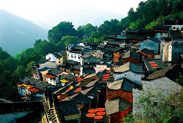 篁岭因“晒秋”闻名遐迩,村落“天街”似玉带将经典古建串接,徽式商铺林立,前店后坊,一幅流动的缩写版清明上河图。挂在山崖上的篁岭古村,地无三尺平,每当日出山头,晨曦映照,整个山间村落饱经沧桑的徽式民居土砖外墙与晒架上、圆圆晒匾里五彩缤纷丰收果实组合,绘就出世界独一无二的“晒秋”农俗景观、最美中国符号。独特的旅游体验带您走过索桥、滑过溜索、乘上高空索道,俯瞰独特的晒秋奇观。每到阳春三月油菜花开,置身篁岭万亩梯田,黄灿灿的油菜花与远山、近水、粉墙、黛瓦相映成趣,宛如一幅绝美的水墨油画。篁岭既是自然的宠儿,也是人文的杰作,更是造物主遗落在人间的一块美玉。
