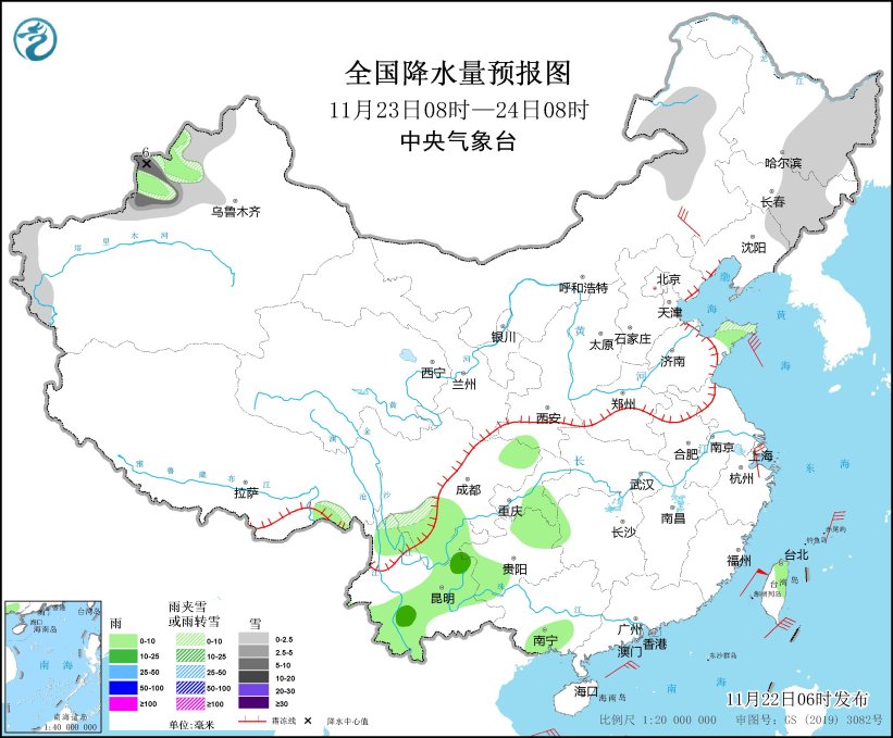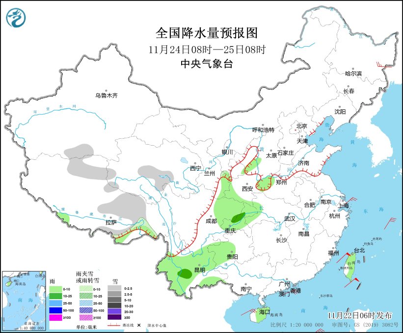 图5 全国降水量预报图(11月22日08时-23日08时)